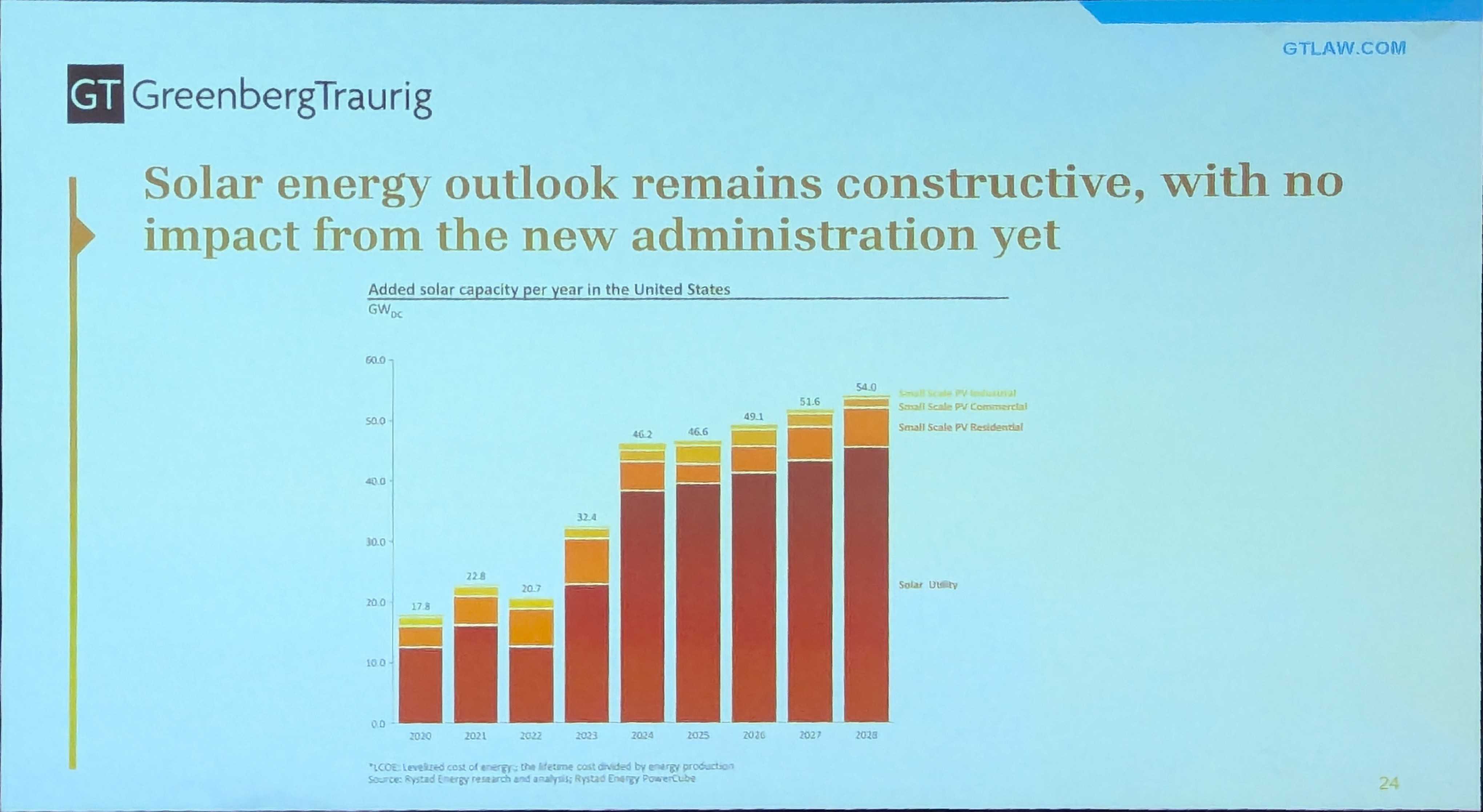 Participants and speakers alike echoed optimism about the future of solar and storage. Despite uncertainty and the desire / rise in gas plants, summit panelists reminded audience members of the 3-5-year development timeline to bring gas turbine peaker plants only. Add in that turbine manufacturers are currently booked out for many years. This industry has thrived for decades on strong fundamentals: cost competitiveness, speed of deployment, and infrastructure flexibility. The energy transition is accelerating, and solar + storage is poised to play a central role in meeting the world's growing power needs.